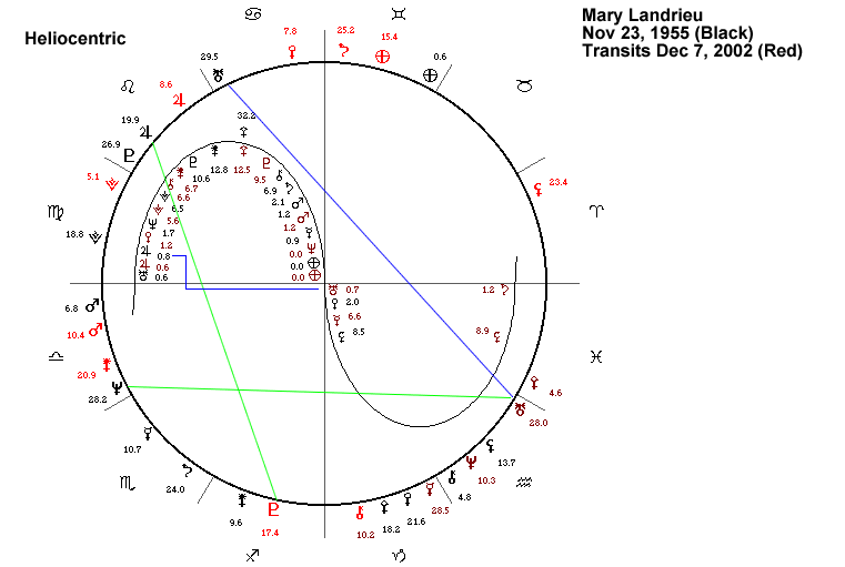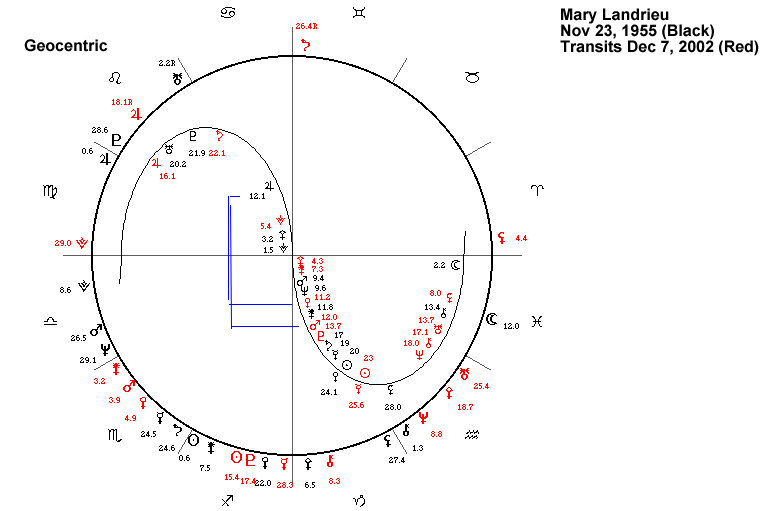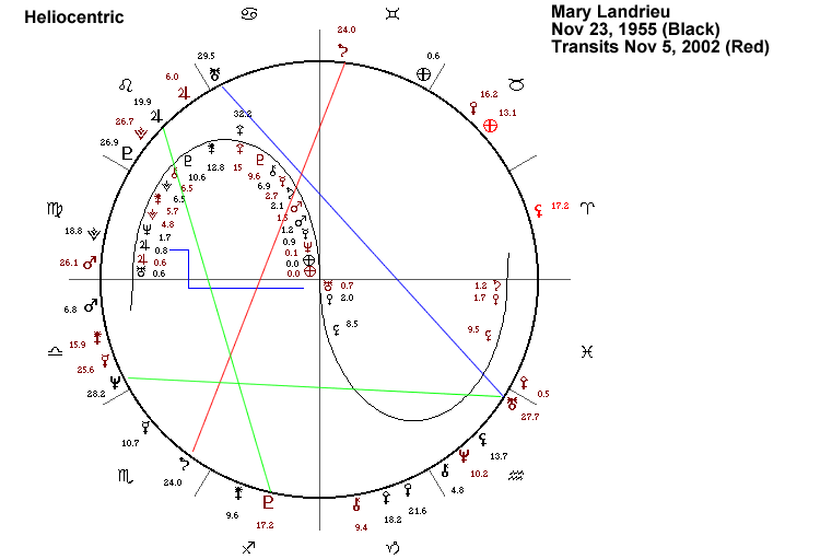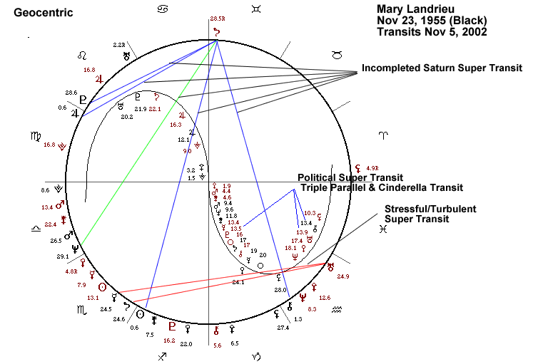 Saturn in Geocentric Longitude stationed on October 11, 2002 at 29.09 Gemini. While this means that Ms. Landrieu had a LOOPED TRANSIT of Saturn sextile to her Pluto and just avoided one by a hair trine to her Neptune ... there are No Good Transits From Saturn...but notice that this means that the Stressful and Turbulent Saturn transits to her Sun, Chiron, Neptune and Jupiter were INCOMPLETED TRANSITS. In fact, by the time of the elections, notice that the second pass of the Looped Transit to her Pluto was also finished