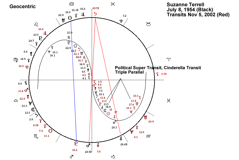 For the first election, when Ms. Terrell came in second, notice that just like Ms. Landrieu she too was having the Super Transit of Pluto and Uranus parallel to her Chiron...and as we noted before, the transit of Pluto to a person's Chiron in an enhancement alignment is a CINDERELLA TRANSIT...but by the time that the run off election came around, the CINDERLLA TRANSIT was gone...and the Stressful and Turbulent transit of Saturn to her Chiron was getting tighter and tighter...in fact, in Geocentric Longitude, Saturn was EXACTLY quincunx to her Chiron on Dec 7th, the day of the election. As if this were not bad enough, Ms. Terrel was having the SAME EXACT TRANSIT IN THE HELIO DIMENSION...so she was having a TRANSDIMENSIONAL HEARTBREAK TRANSIT...and in the Geocentric Dimension she was having a LOOPED HEARTBREAK TRANSIT. (Also look at all of the Stressful and Turbulent T-square alignments that brewed up in Terrel's transits right around Dec 7 2002. Symmetrical Planetary Geometry is always powerful...and T-squares are Symmetrical Stressful and Turbulent Planetary Geometry...they are always a sign of great stress and turbulence. Always.