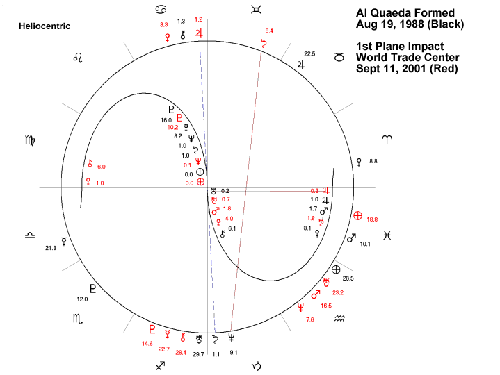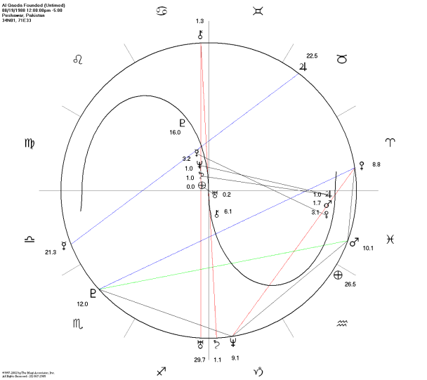 If September 11, 2001 was a day that changed America – and the world – forever, it was the day that Al Qaeda took over the world stage and defined itself for the ages. Al Qaeda destroyed all of its bridges that day along with the Twin Towers, so that there could be no turning back. Anyone who knows astrology well would naturally expect to see this written in the stars, and the place where one would look for it would be in the transits on that day to Al Qaeda’s birth chart. Now we finally have that chart, and so we can at long last look behind what was happening outwardly to discern its celestial context and true meaning.
